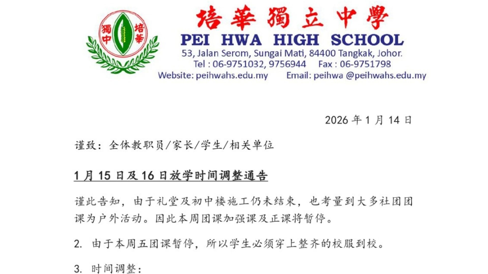 1月15日及16日放学时间调整通告