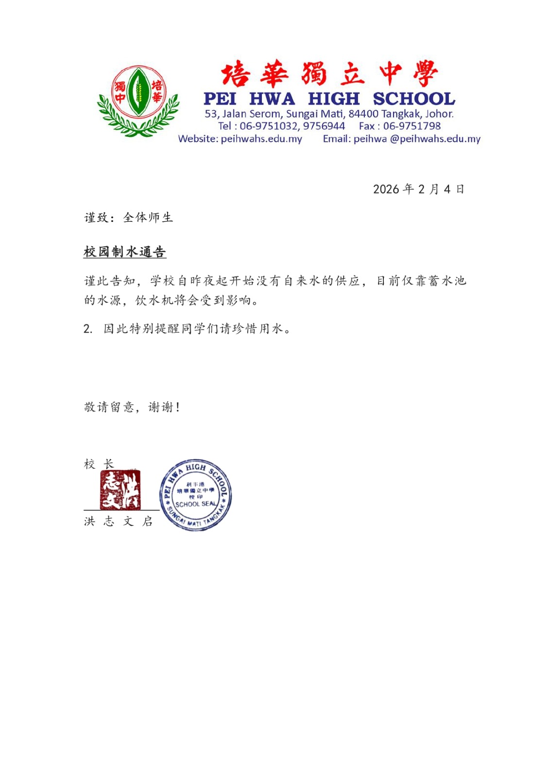 利丰港培华独中 校园通告