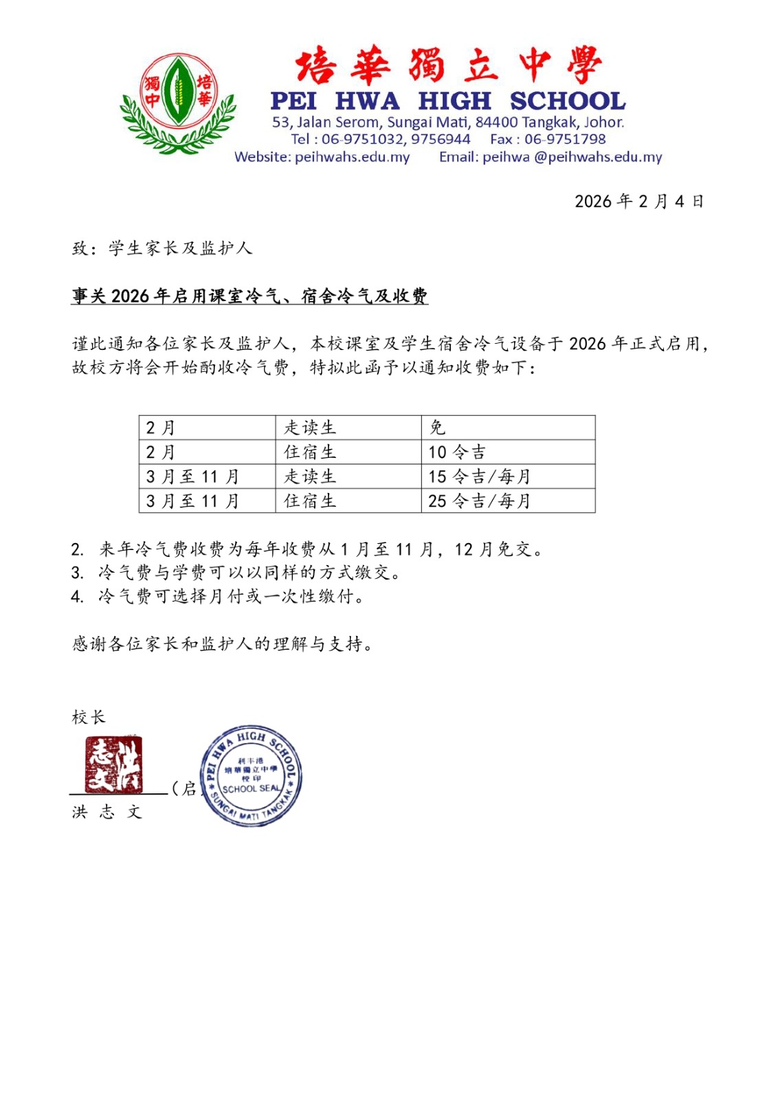 事关2026年启用课室冷气、宿舍冷气及收费