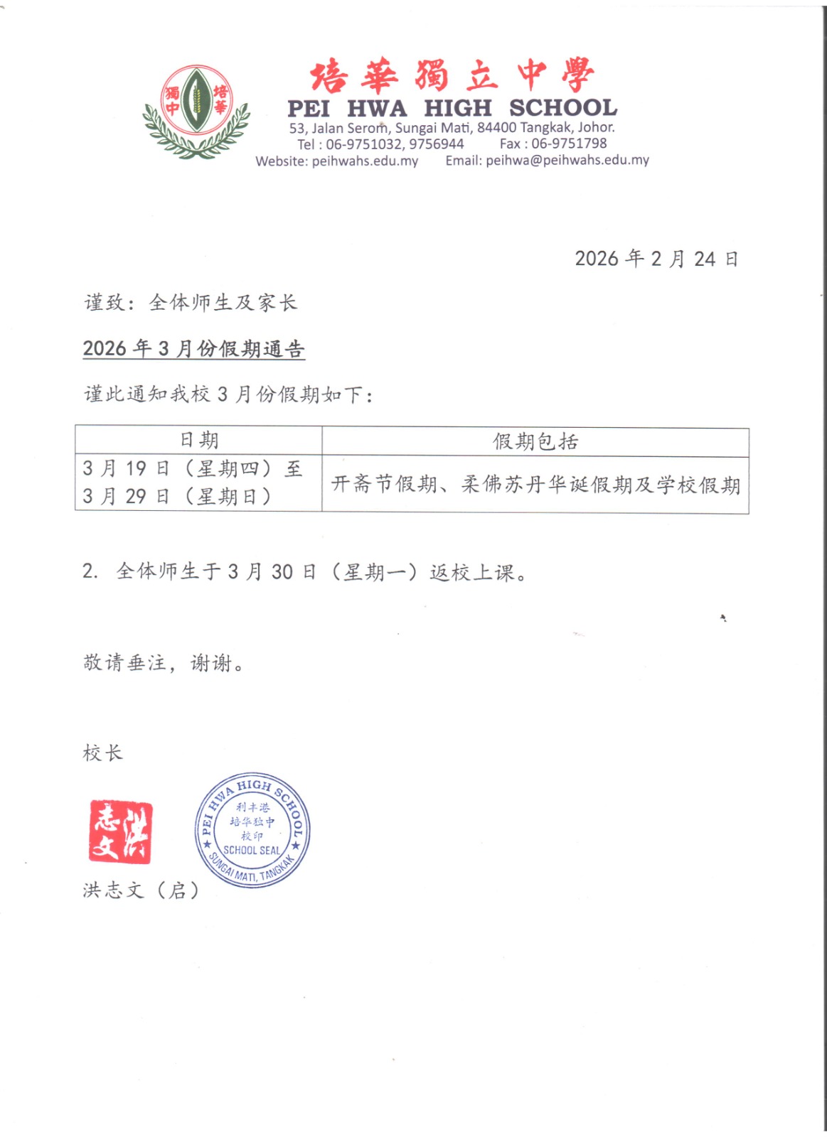 电子邮箱: peihwa@peihwahs.edu.my