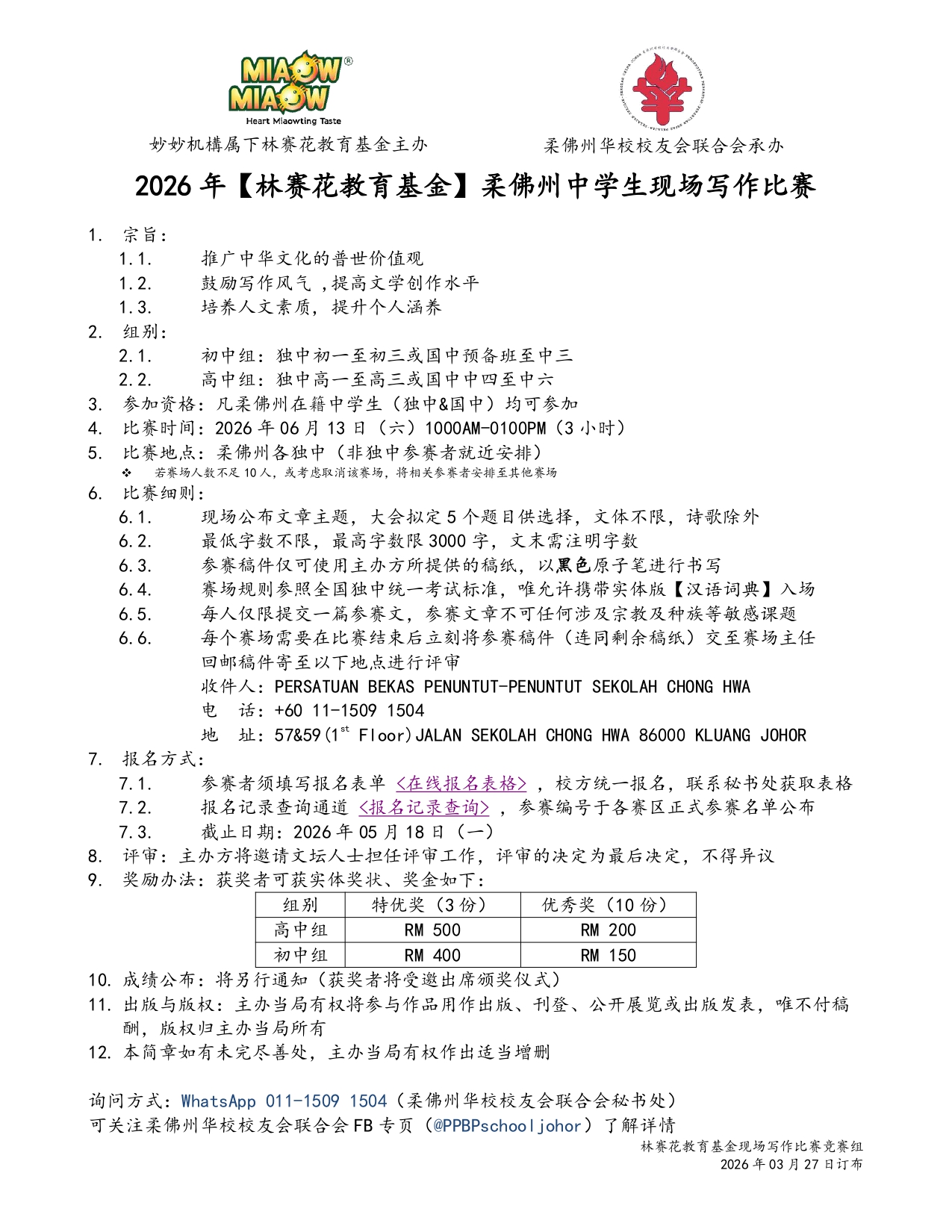 2026年【林赛花教育基金】柔佛州中学生现场写作比赛