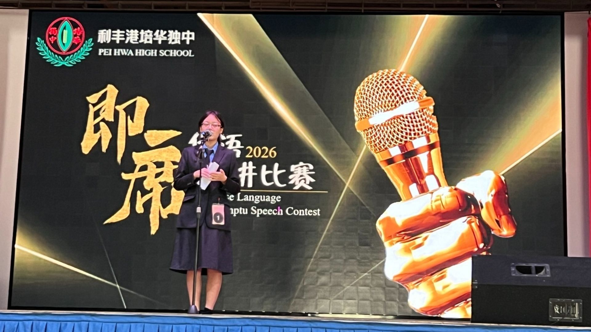 本校于4月8日举行华语即席演讲与马来文演讲比赛,分为初中国文、初中华文、高中国文及高中华文四个组别进行。参赛同学在台上展现出良好的语言表达能力与自信风采。