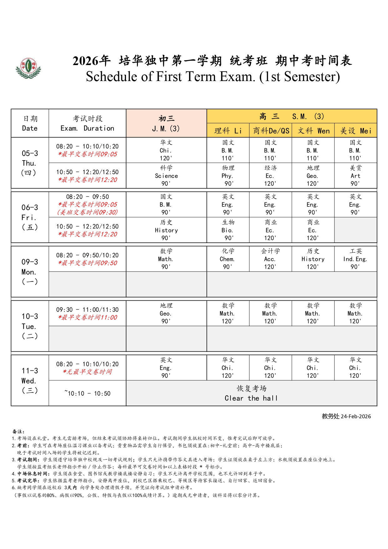 2026第一学期统考班期中考 考试时间表